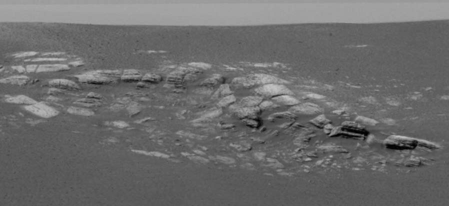 A sonda Opportunity enviou excelentes fotos tiradas pelo seu microsc�pio do solo marciano e de um belo afloramento onde s�o claras as estratifica��es. Sinais de sedimentos ou de tufos vulc�nicos? A foto 1 (clique para ampliar) mostra claramente um afloramento de rocha estratificada circundada pela areia marciana. Em alguns pontos do afloramento as estratifica��es parecem estar formando sets distintos como em uma estratifica��o cruzada. Com estas imagens aumenta o interesse da equipe de ge�logos da Nasa em busca de sinais de vida. � claro que a estratifica��o pode ser de car�ter e�lico ou mesmo derivada da deposi��o de sedimentos vulcanocl�sticos. Mas a possibilidade de serem sedimentos sub-aqu�ticos ati�a a imagina��o de todos. J� nas fotos tiradas pelo microsc�pio da Opportunity a situa��o � outra. As fotos 2 e 3 mostram em detalhe (mil�metros) o solo marciano. Nestas fotos foram visualizadas pequenos "fragmentos" esf�ricos a sub-esf�ricos com cavidades. Estas "esferas" como est�o sendo chamadas pelos cientistas s�o muito interessantes e sugerem uma multiplicidade de hip�teses conforme abaixo: